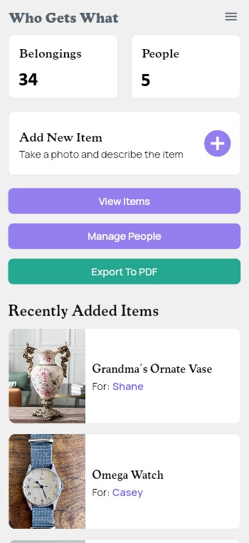 The Who Gets What app helps you document your belongings, assign them to the people you love, and tell the stories and significance of each item. Easily export a clear PDF that you can share with family or keep with your will.