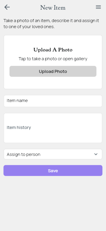 Quickly add belongings with a photo, name, and notes - ideal for sentimental items that matter most.